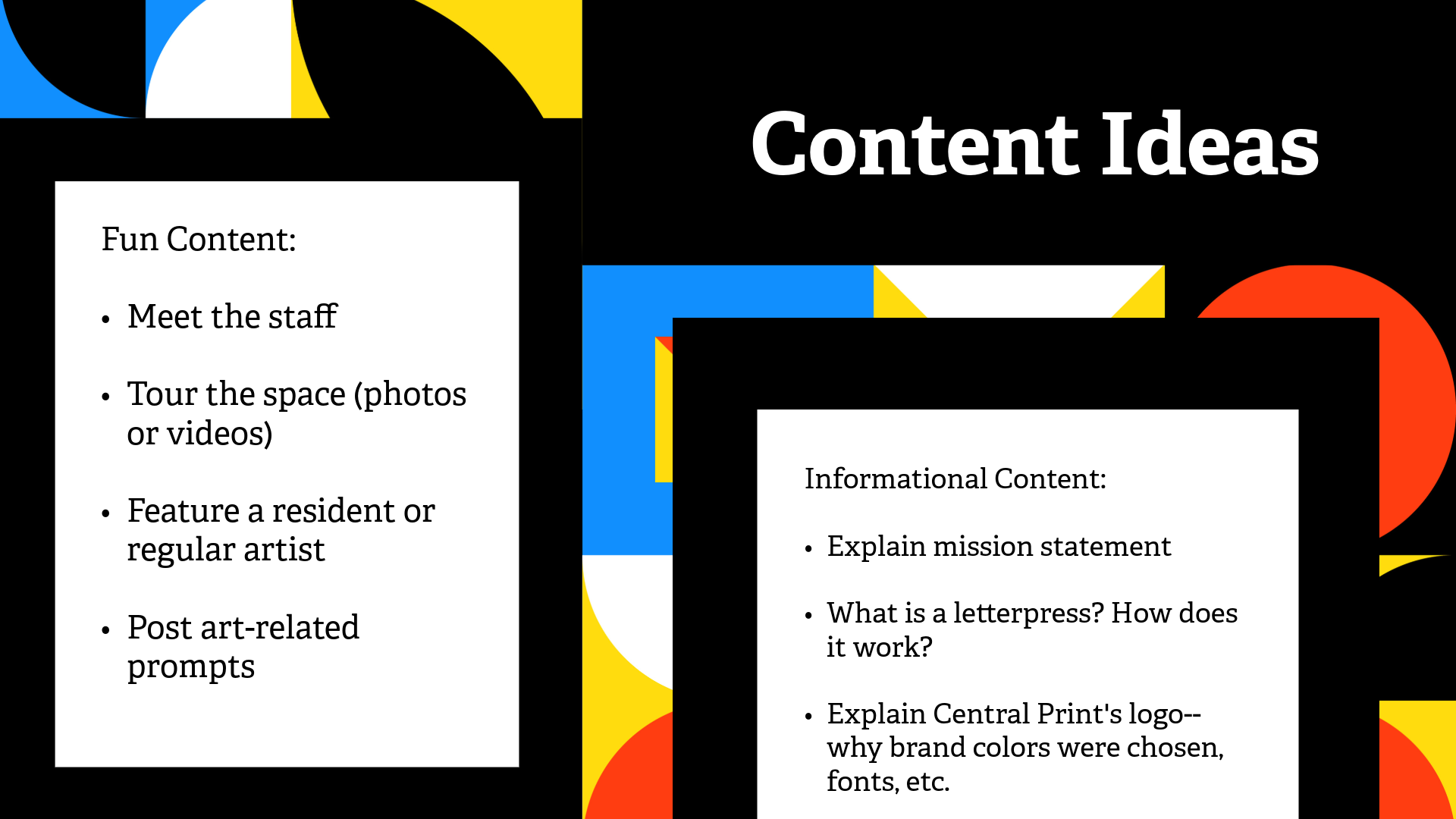 social media content Social Media Marketing Guide created for Central Print, a nonprofit community art studio in St. Louis